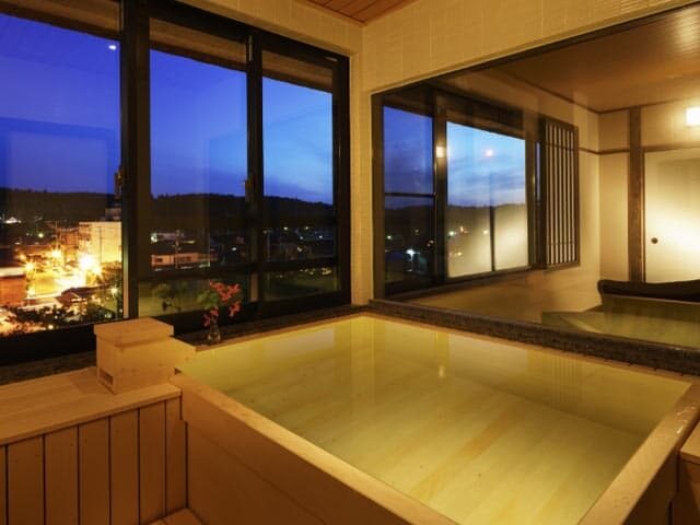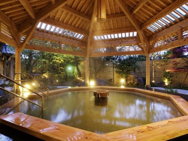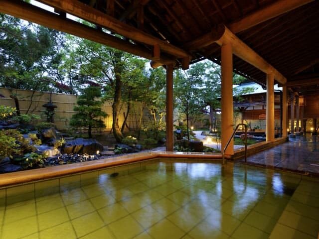 エメラルドグリーンの源泉を全ての湯船で。月岡温泉とコンパニオンを堪能できる宿。