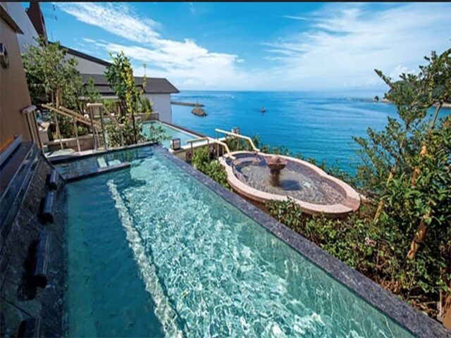 オーシャンビューのお部屋と露天風呂。潮風が耳に心地よい寛ぎのホテル。
