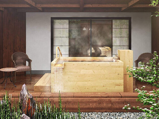 全国に先駆けて導入した畳風呂や渓流を一望できる露天風呂。そして、美景すら貸切できる貸切露天風呂が人気 です。