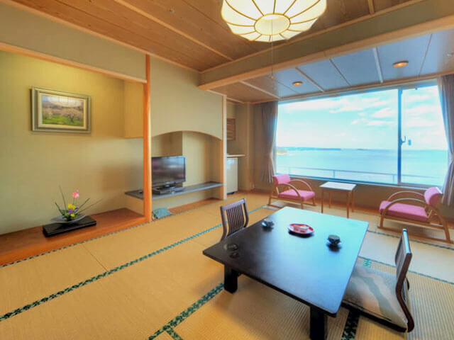 東館の海側の部屋だったので、寛ぎながら大きな窓で海が一面に見えて絶景でした。