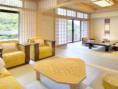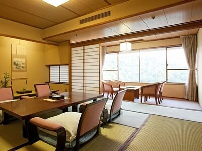 | お部屋 | お部屋は和室を基調に落ち着きのあるインテリアで設え、和室・洋室・和洋室をご用意しております。 ・和室 ・和洋室 ・洋室(ツイン・スモールツイン) ・眺望風呂付和洋室 ・露天風呂付客室(和洋室・洋室ツイン) ・貴賓室 |