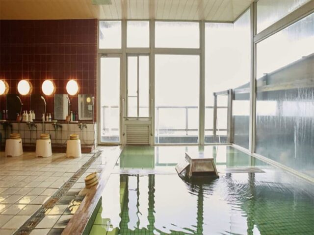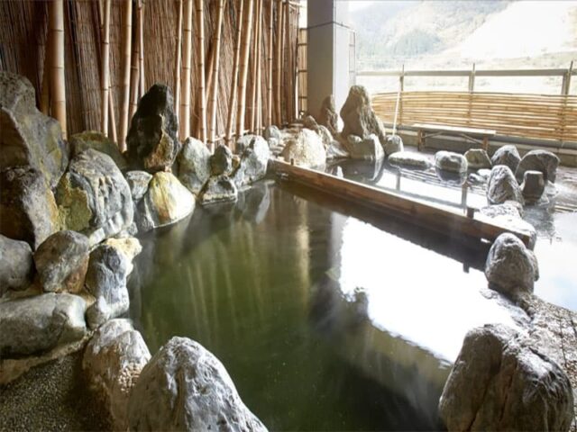 こちらの旅館では、温度によって湯舟を分けており、同時に3色のお湯を楽しむことができます。